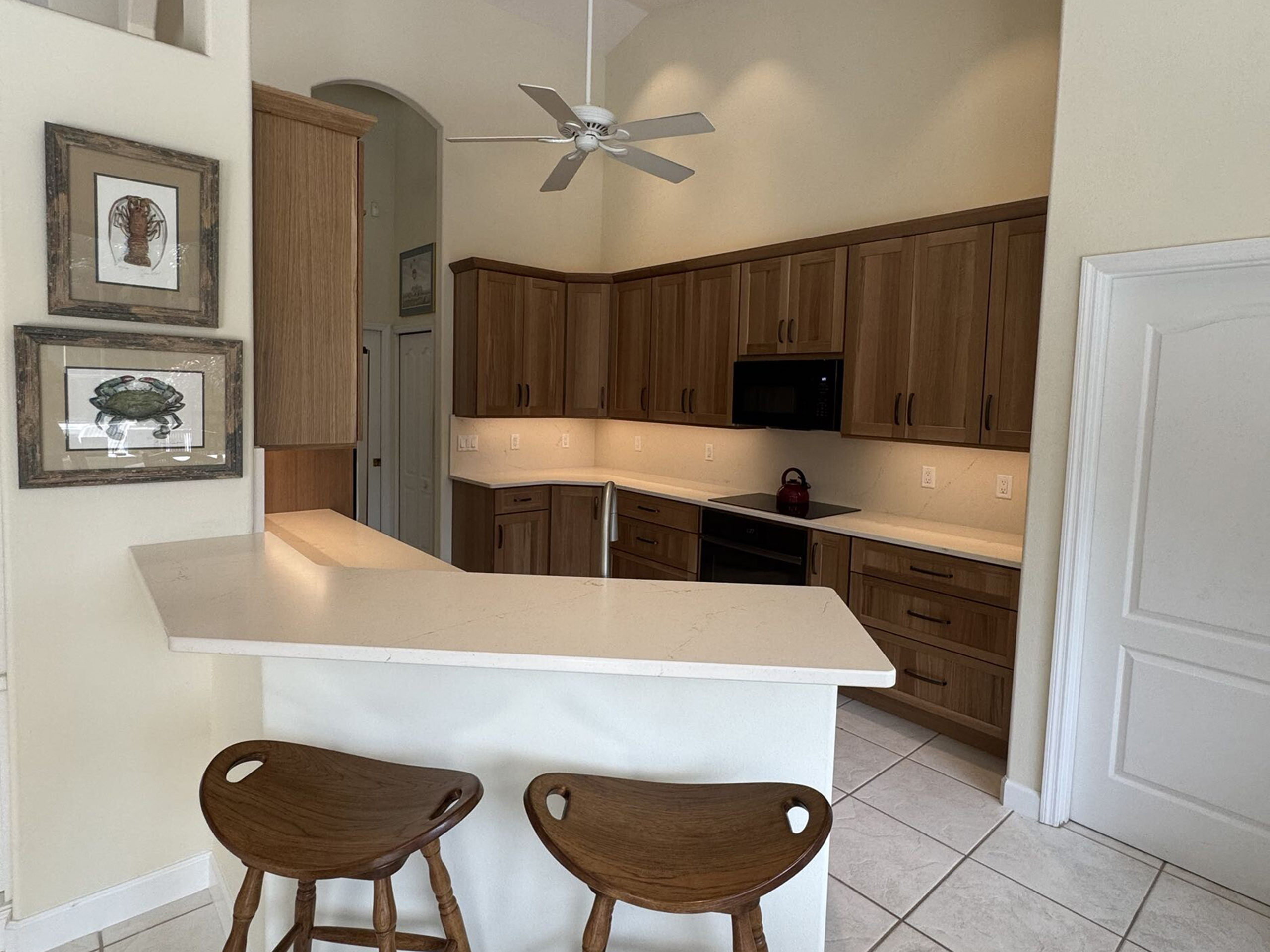 Todd Thomas Home’s licensed kitchen remodelers incorporated under-cabinet lighting throughout, eliminating shadows and creating a more pleasant cooking environment. The removal of the dated decorative tile border in favor of a clean, simple backsplash visually expanded the space. Our kitchen remodeling specialists maintained the vaulted ceiling and ceiling fan, which continues to provide excellent air circulation and a sense of spaciousness.